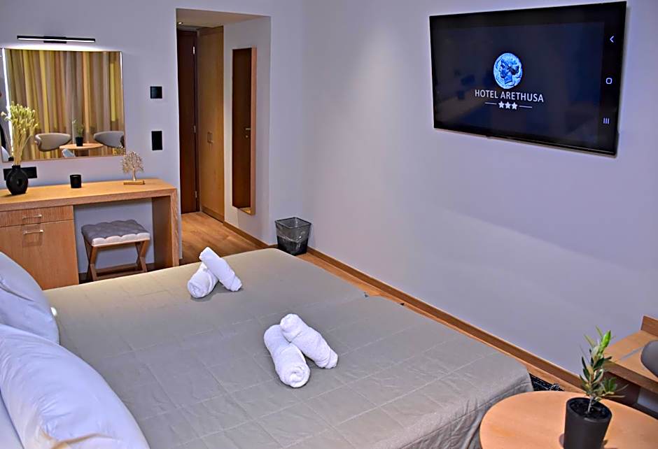 Air-conditioned room with a large single bed, TV, fridge and private bathroom.
